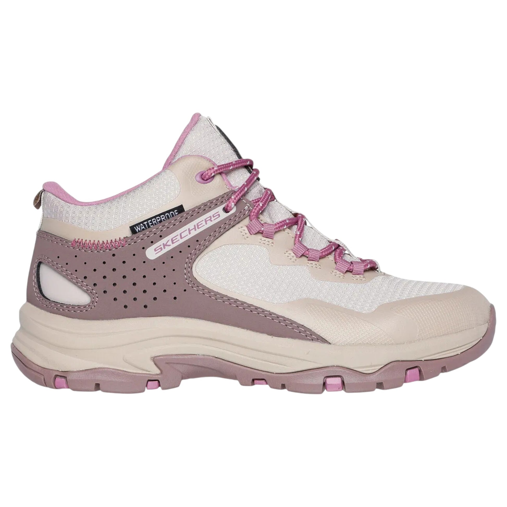 Go off-roading in outdoor style and roomy comfort with Skechers Womens Trego Tuscarora. This lace-up hiking boot features a waterproof textured mesh and synthetic overlay upper with a Skechers Air-Cooled Memory Foam insole.
